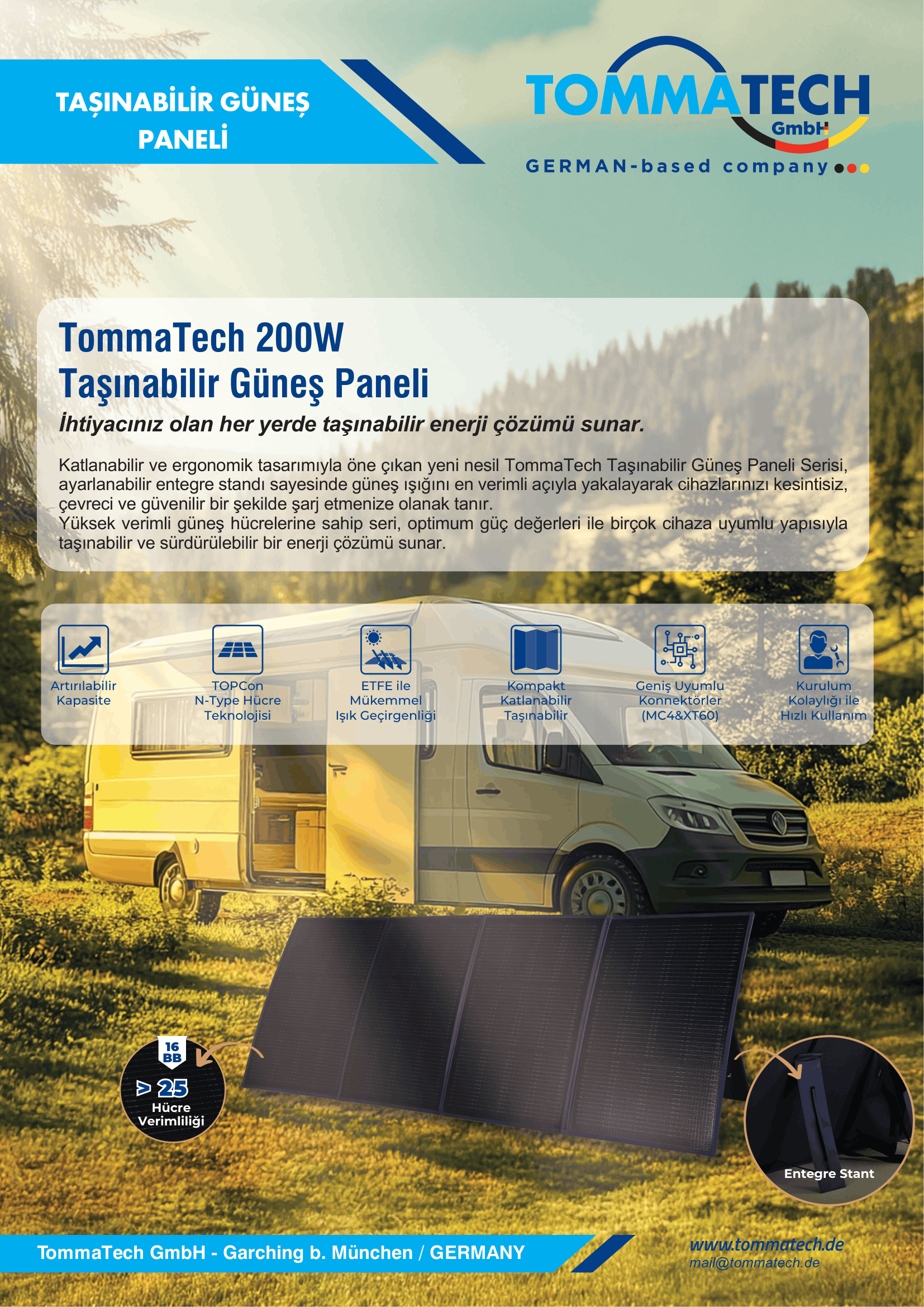 Katlanabilir ve ergonomik tasarımıyla öne çıkan yeni nesil TommaTech Taşınabilir Güneş Paneli Serisi, ayarlanabilir entegre standı sayesinde güneş ışığını en verimli açıyla yakalayarak cihazlarınızı kesintisiz, çevreci ve güvenilir bir şekilde şarj etmenize olanak tanır.